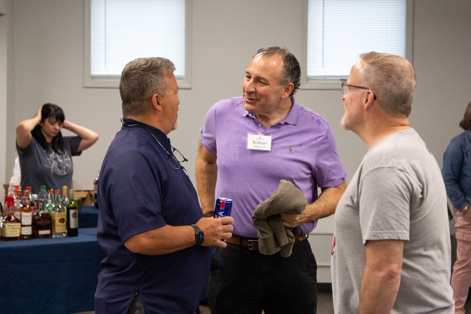 From left to right: Roger Thompson ’87, Bill Holmes ’89, and Mike Kramer ’89 reconnect inside The Gathering Place.